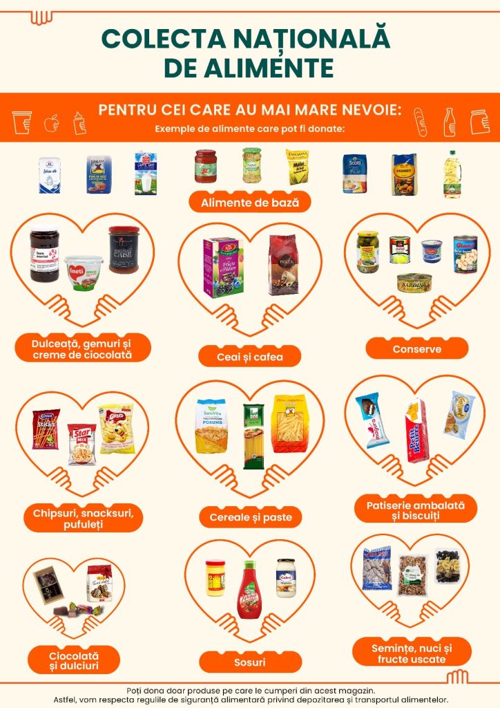 Alege alimente neperisabile, pune-le în plasa portocalie a colectei și lasă-le în cutia specială de la ieșirea din magazin. Voluntarii din cadrul organizațiilor beneficiare le vor duce celor care au cea mai mare nevoie.